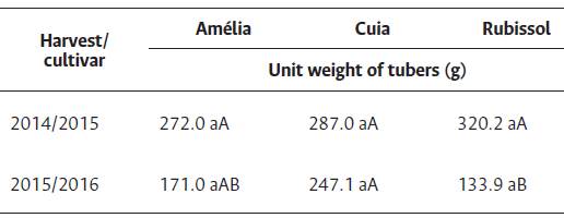 In this study, we observed variation between potato unit weight (Table 1). In relation to the agricultural year (harvests), the only cultivar that presented statistically significant differences between one year and the other was Rubissol, which obtained a larger unit weight of tubers in the 2014/2015 harvest (320.2 g) compared to the 2015/2016 harvest (133.9 g).