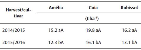 The productivity of tuberous roots varied between 15.2 and 19.8 t ha-1 in the 2014/2015 crop and between 12.3 and 16.1 t ha-1 in the 2015/2016 crop for cultivars Amélia and Cuia, respectively (Table 2), with no differences in tuber production between cultivars, only between cropping cycles.
