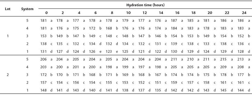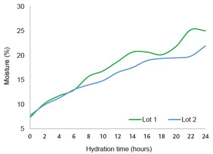 four repetitions of 25 seeds from each lot were used in each hydration period. The moisture determination was done by the oven method at 105 °C (± 3 °C) for 24 hours and the results are expressed in percentage of humidity based on wet matter, according to Brasil (2009).