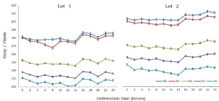 The gray scale values of the radiographic images are shown in Figure 3. These measurements, which represent a value from 0 to 255 for each pixel, fluctuated between 120 and 215, with dark and light tones, respectively. In general, there was a difference in each hydration period between seed sizes; smaller seeds (lot 1) had lower values (darker shades of gray) and larger seeds (lot 2) had higher values (lighter shades of gray) (Figure 3). Depending on the atomic composition of the chemical elements and the density of the tissues, the image is formed with darker shades of gray (tissues composed of elements with a low atomic number, such as H = 1, C = 6, N = 7 or empty spaces inside the seed) or lighter shades of gray (tissues with higher density and atomic number of constituent elements). For the five radiographic image analysis systems (S5), a linear trend was observed between lots, but with differences in the gray scale values. For both lots, there was variation in the gray scale during the first hours of hydration (four hours for lot 1 and two hours for lot 2). Subsequently, there was a tendency to decrease until 2 hours and increase until 4 hours in all systems, coinciding with the reduction in water accumulation in these periods, shown in the degree of moisture curve (Figure 2). Finally, the image analysis systems in the two lots showed a tendency to increase in hue until 10 hours (Figure 3). In the radiographic analysis of seeds, it is important to consider the degree of seed moisture. According to Simak (1991), the water content of the seeds can influence the optical density, that is, the lower the humidity, the greater the optical density, which would facilitate the visualization of the internal parts of the seeds through the radiographic image. Souza et al, (2008) found that the low water content of the seeds (6 to 8 %) led to a higher optical density on the radiographs, allowing a better visualization of the internal morphology in Platypodim elegans Vog seeds. As in the case of the imbibition curve, each species has its own characteristics of density and composition of the tissues, which are factors that interfere in the quality and characteristics of the images.