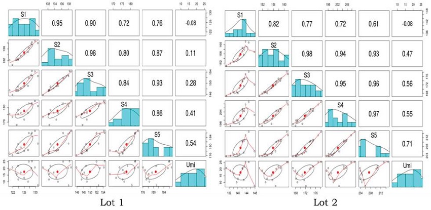 The variable degree of moisture determined by the oven method at 105 °C, and the gray scale values, evaluated by the radiographic image analysis systems (S), are shown diagonally in Figure 4 for lots 1 and 2, respectively. These variables, in some cases, showed a correlation between the two methodologies used with soybean seeds in this research. For lot 1, a moderate positive correlation was observed for the degree of moisture and the shades of gray in the cotyledon region determined by S5, with lighter shades of gray within the image, which characterizes a higher degree of moisture in the seed. The areas close to the seed coat and the points in the cotyledon region showed a low positive correlation with the degree of moisture (Umi) (Figure 4). This can be explained due to the globe shape of the soybean seed, which, when the radiographic image (two- dimensional) is obtained, there is less attenuation of the X-ray photons at the seed edge because it has less thickness in relation to the central region. For lot 2, there was a strong positive correlation between the gray tones of the cotyledon región determined by S5 and the degree of seed moisture, evaluated with the oven test, similarly to that observed for lot 1, this region was characterized with shades of lighter gray in the image of the seeds. For areas close to the seed coat and points in the cotyledon region, a moderate to low positive correlation was observed with the degree of moisture, respectively (Figure 4).
