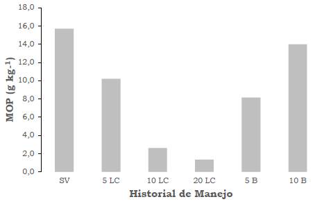 El contenido de MOP, disminuyó significativamente en la medida en que el suelo fue sometido a labranza, pasando de 78,5 g kg-1 en SV a 51,0, 12,9 y 6,7 g kg-1 después de 5, 10 y 20 años de LC, respectivamente (Figura 1), resultado similar reportan para un molisol en Etiopía, después de 26 años de cultivado hubo pérdida significativa de la MOP (Ashagrie et al., 2007).