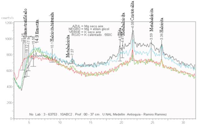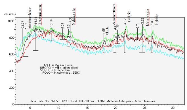 Las arcillas presentes en el suelo virgen son: ínterestratificados, clorita, haloisita, methaloisita, montmorillonita, comunes a los suelos derivados de cenizas volcánicas (Nanzyo, 2002; Besoain, 1985) (Figura 3). El análisis por Rayos X revela el patrón mineralógico característico de los andisoles: alófana- haloisita-caolinita (Nanzyo, 2002; Malagón et al., 1991).