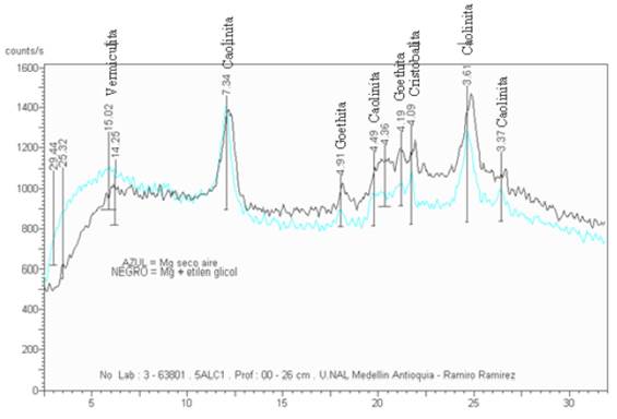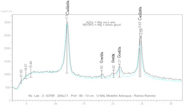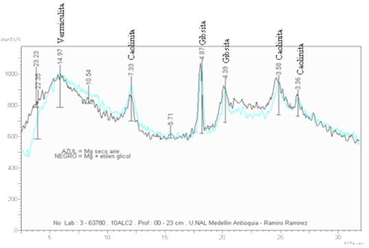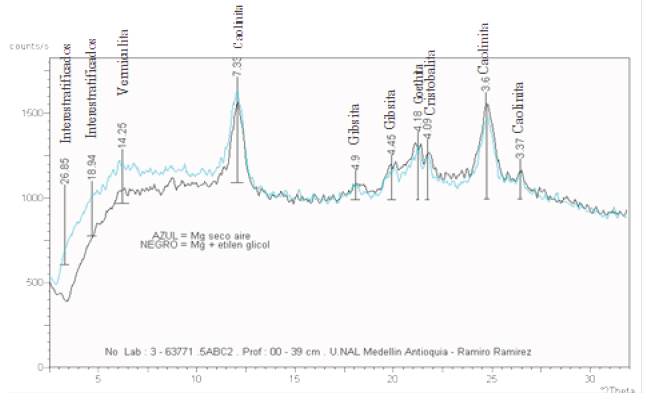 La composición mineralógica se determinó por difractometría de rayos X (DRX) en las muestras saturadas con Mg y etilenglicol, tratadas a temperatura de 550 °C de acuerdo a la metodología para el análisis de suelos del IGAC (2006).