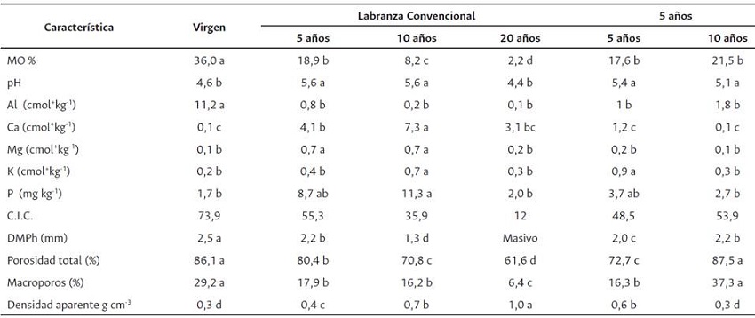 El contenido en materia orgánica (MO) fue significativamente menor en los suelos labrados a 5, 10 y 20 años (18,9%, 8,2% y 2,2% respectivamente) que en SV (36,0%) (Tabla 1). Sin embargo, el contenido en MO después de 5 y 10 años de barbecho (17,6 % y 21,5%, respectivamente) aumentó respecto de los suelos labrados pero sin alcanzar el contenido evidenciado en el suelo virgen. El contenido de MO después de 5 y 10 años de LC (18,9% y 8,2%) disminuyó respecto del suelo virgen (36,0%) (Tabla 1). Consecuentemente la MO después de 5 y 10 años de barbecho (17,6 % y 21,5%, respectivamente) se incrementó significativamente respecto de los suelos con LC pero sin alcanzar el contenido evidenciado en SV.