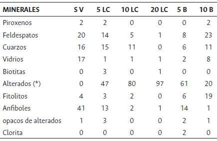 Las arenas de estos suelos muestran abundancia de cuarzo, con excepción de los suelos de 20 años LC y los suelos de 5 años de B (Tabla 2); los feldespatos predominan en SV, suelos de 5 años de LC y suelos de 10 años B; los anfíboles son más abundantes en SV, en suelos de 5 años LC y suelos de B durante 5 años, también se encuentran piroxenos y vidrios, minerales típicos de suelos derivados de cenizas volcánicas (IGAC, 2007).