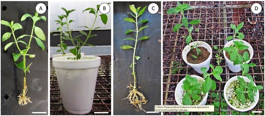 Los resultados obtenidos en este estudio demuestran que las estacas de segmentos de tallos de H. teyucuarensis no necesitan ser tratadas con ANA para lograr el enraizamiento. Si bien la adición de hormonas para inducir el desarrollo de raíces en estacas es uno de los factores más estudiados en la propagación vegetativa y fue demostrado que la aplicación de auxinas tiene gran efecto sobre este proceso morfogénico en especies de la familia Lamiaceae (Sevik y Guney, 2013; Saglam et al., 2014; Shahhoseini et al., 2015). En este trabajo, al igual que los estudios de Bona et al. (2012) y Bezerra-Carvalho et al. (2015), la incorporación de hormona no es un factor relevante en la inducción de raíces.