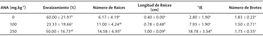 En el sustrato corteza de pino en la estaca subapical del tratamiento libre de hormona se observa el mayor porcentaje de enraizamiento y número de brotes, no obstante, la cantidad de raíces desarrolladas son menores que en el tratamiento de 250 mg.kg-1 de ANA (Tabla 2).