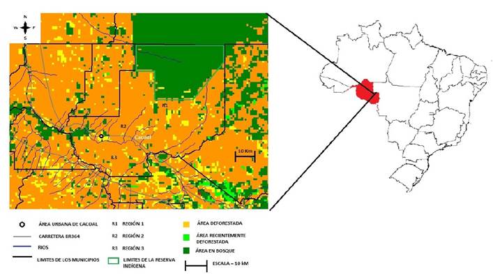 El estudio fue implementado en 15 propiedades rurales, distribuidas en tres regiones en el municipio, con cinco propiedades por región. Esas propiedades fueron seleccionadas de forma aleatoria, pero teniendo como requisito básico pertenecer a familias de estudiantes del Instituto Federal de Educación Tecnológica de Rondônia, para facilitar el acercamiento a esos agricultores. En la selección de esas regiones se utilizaron como criterio algunas características contrastantes. La región 1 comprende las cercanías del resguardo o reserva indígena Paiter-Suruí, el cual posee una mayor diversidad y flujo de especies debido a la influencia de la reserva; la región 2 representa las cercanías de la ciudad de Cacoal, que ejerce una fuerte influencia sobre la región, y es la más intervenida por el hombre; finalmente, la región 3 se asigna a la parte sur del municipio, a la orilla izquierda del río Machado (sector Prosperidade). Este río, que presenta un ancho de aproximadamente 100 m, puede ser una barrera geográfica tanto para especies vegetales como animales (Figura 1).