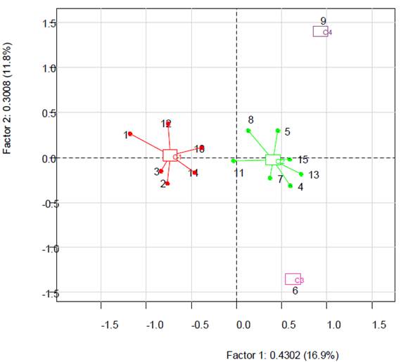 El resultado del Análisis de Correspondencias Múltiple (ACM) con un conjunto de variables categóricas obtenidas de las 15 fincas correspondientes a información sobre su manejo y sobre sus habitantes, así como los datos geográficos y el estado socioeconómico de cada finca se puede observar en la Figura 2. Estas se distinguieron en cuatro grupos. El primero grupo está conformado por 6 fincas, donde se encuentran personas jóvenes (hasta los 40 años), con muy poca o casi ninguna área de reserva legal, y lo que producen en la finca como una forma de ingreso económico lo explotan en su totalidad. Estas personas viven en la zona rural hace un tiempo relativamente corto.