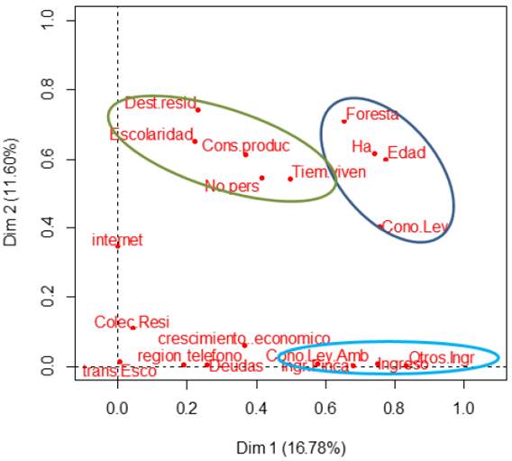 Del análisis del primer plano factorial del ACM (Figura 3) se destacan las siguientes asociaciones: en el círculo verde se distinguen las fincas por algunas condiciones de la persona encargada y el manejo de la finca. Hay una relación entre el tiempo de permanencia en la finca, el nivel de escolaridad del encargado o dueño, el consumo de su producción y el destino de los residuos con la cantidad de floresta, lo que indica que el manejo de algunas cosas en particular se relaciona con la conservación forestal.