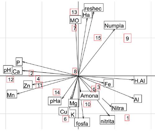 El resultado del análisis de componentes principales muestra que las fincas 7, 9, 13 y 15 son las que presentan mayores índices de materia orgánica, mayor área de la finca en hectáreas, mayor área en reserva legal y mayor número de especies de plantas en la finca (figura 4). Esas fincas son todas ganaderas.