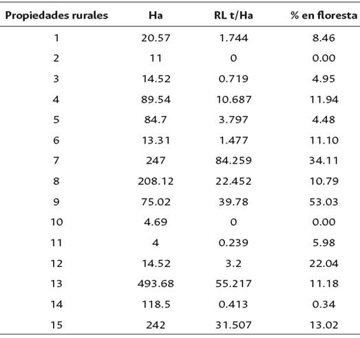Igualmente, se evaluó la relación entre el área total de la finca y el área dedicada a la reserva legal (RL) (Tabla 1). La finca 9 presentó el mayor porcentaje (53.03 %) de RL mientras que las fincas 2 y 10, de tamaño pequeño, presentaron 0 % en área en RL; la finca 14, de mediana área, arrojó un 0.34 % de RL.