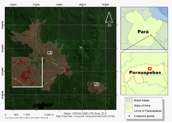 The fruits were collected from populations of I. cavalcantei in the Carajás National Forest (FLONACA), Southeast Pará State (58°06’73.0” S and 93°32’07.1” W). The fruit collection took place at random in June 2019, covering the areas N1 and N2 in the Canga habitat (Figure 1). This collection was authorized by the Instituto Chico Mendes de Conservado da Biodiversidade (SISBIO 67760-1). According to the Koopen Climate Classification, the climate in this region is “AWi” type (Hartwig, 2016), indicating a tropical rainy climate with winter drought, in which the annual rainfall varies between 2000 mm and 2400 mm, and the monthly average temperature is greater than 18 °C. During the fruit processing, heavily damaged seeds (predated by insects or poorly developed) were removed. Before analysis, the seeds were disinfected with fungicide Captan® 5 % for five minutes.