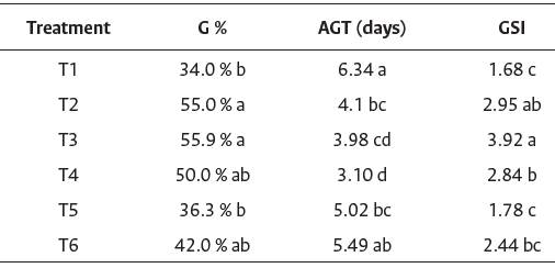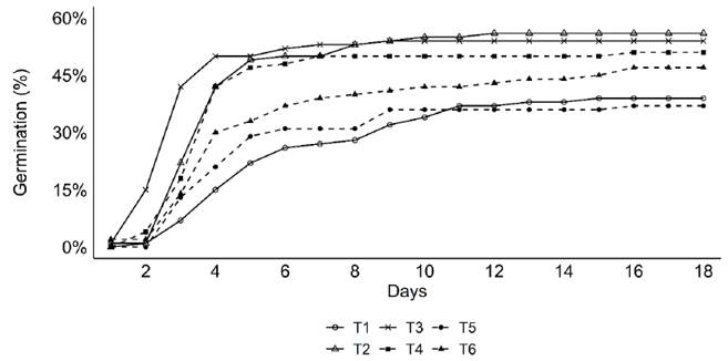Treatment T1 presented the lowest GSI in relation to the other treatments and, consequently, had a longer AGT. The means of the GSI values obtained in treatments T1, T5, and T6 did not show a significant difference, with a smaller number of seeds germinated daily. Mechanical and chemical scarification and immersion in hot water generate small openings in the tegument, thereby increasing permeability and allowing imbibition (Maldonado- Arciniegas et al., 2018).
