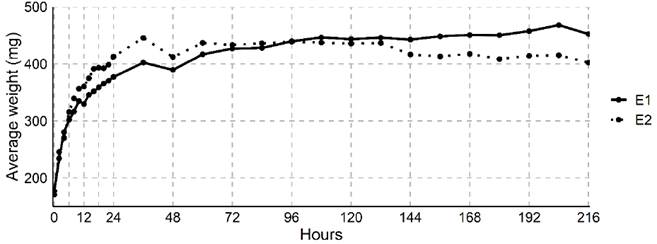 The imbibition process of the I. cavalcantei seeds resulted in a three-phase imbibition pattern (Figure 3). In the first phase (phase I), E1 and E2 showed increasing average mass values as a result of high water absorbency. The seeds scarified with sandpaper had an average initial weight of 200 mg and an average final weight of 452 mg, which is 12.4 % higher than that of the E1 treatment. The increase in water absorption in the treatment with scarification was higher in phase I, and it stabilized in both treatments after 72 hours. Imbibition results reinforce the idea that scarification is more interesting to increase the efficiency of germination.