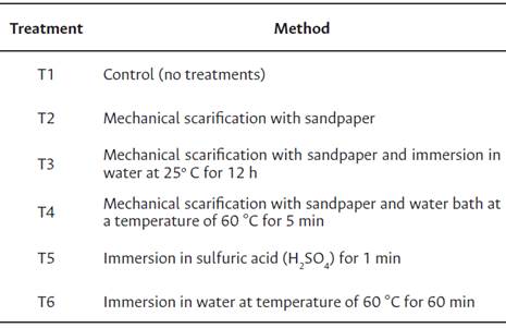 The six pre-germination treatments included mechanical, physical, and chemical methods, as summarized in Table 1. After the pre-germinative treatments, the seeds were placed in petri dishes on two sheets of paper towels (Germitest®) moistened with distilled water, at a proportion of 2.5 times the weight of the dry paper (Brasil, 2009). The treatments were placed in a biochemical oxygen demand chamber, regulated at a constant temperature of 25° C and a photoperiod of 12/12 h (light/dark). All treatments were designed in completely randomized blocks and replicated five times with 20 seeds each, totalizing 100 seeds per treatment.