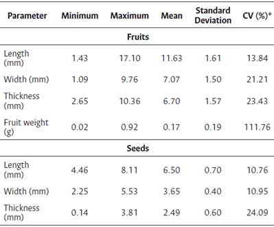 The biometric characterization was performed after processing the fruits and seeds, with a sampling of 100 fruits and 100 seeds. The variables measured were: i) length, width, and thickness (mm), measured using a digital caliper with a degree of accuracy of ± 0.01 mm; and ii) weight (g), measured using a digital analytical balance with a precision of 0.001 g. With the obtained data, it was possible to estimate the minimum, maximum, average, standard deviation, and coefficient of variation (CV) of the samples. The moisture content was determined according to the methodology described by Brasil (2009), using three samples of 10 seeds that were weighed and dried. The results obtained were expressed as percentages.