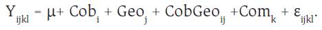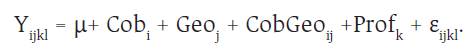 Donde, (μ es el efecto promedio, Cob el efecto del tipo de cobertura (K15, K1530, K30, B y He), Geo es el efecto de la geoforma (Pn, Cc y Cx), Prof es el efecto de las profundidades (0-20, 20-40, 40-60, 60-80 y 80-100 cm) y e es el residuo.