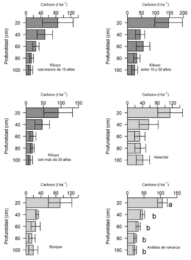 Hubo una disminución de las existencias de C orgánico a medida que aumentó la profundidad en el suelo (Figura 1). Las existencias de C en los primeros 0-20 cm de profundidad fueron de 100 t ha-1, mientras que a 80-100 cm de profundidad, fueron de solo 20 t ha-1 (P<0.05). El suelo bajo cobertura de kikuyo de diferentes edades de establecimiento sin tener en cuenta el tipo de relieve, presentó existencias de alrededor de 220 t ha-1 de C desde 0 cm y hasta los 100 cm de profundidad; y no se presentaron diferencias con las coberturas de bosque o de helechal.