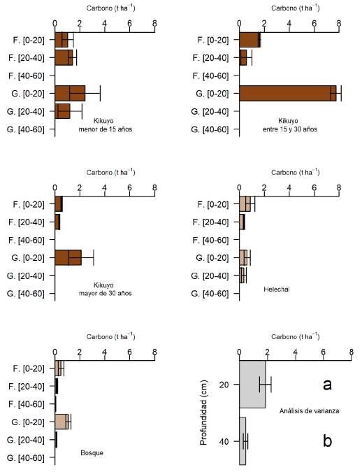Se empleó un diseño en bloques aleatorizados correspondientes al tipo de cobertura: cobertura de pasto kikuyo establecido hace menos de 15, pasto kikuyo establecido entre 15 y 30 y establecido hace más de 30 años (K15, K y K30, respectivamente), cobertura de bosque (B1) y cobertura de helechal (He). Los tratamientos estuvieron en arreglo factorial de tres geoformas (cóncavo Cc, convexo Cx y plano Pn) por cinco profundidades de muestreo (0-20, 20-40, 40-60, 60-80 y 80-100 cm). Se realizaron análisis de varianza para las variables: cantidad de C en el suelo y raíces finas y gruesas, tallos, hojas, estolones y biomasa muerta, densidad aparente y pH del suelo.
