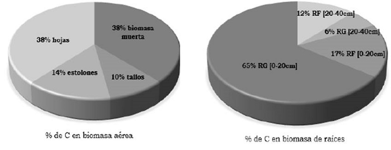 Para estimar la biomasa radicular, las raíces se separaron en raíces finas y raíces “gruesas” (denominadas así por provenir en su mayoría del desarrollo de los rizomas y los estolones de la planta) y luego se lavaron y secaron al horno a 60 °C hasta alcanzar peso constante. Las muestras se molieron utilizando un molino de cuchillas (Thomas Wiley®) y luego se pasaron por un tamiz de 0.5 mm. La biomasa aérea se midió para los compartimentos de hojas (H), tallos (T), biomasa muerta (BM) y estolones (Est) y se procesaron de forma similar a las raíces. La densidad aparente del suelo se determinó mediante el método del cilindro para cada una de las profundidades. El C orgánico total se determinó mediante la metodología de digestión por vía húmeda de Walkley y Black. El contenido de C orgánico del suelo por hectárea se calculó con base al contenido de C, la densidad aparente y el espesor de cada profundidad de muestreo.