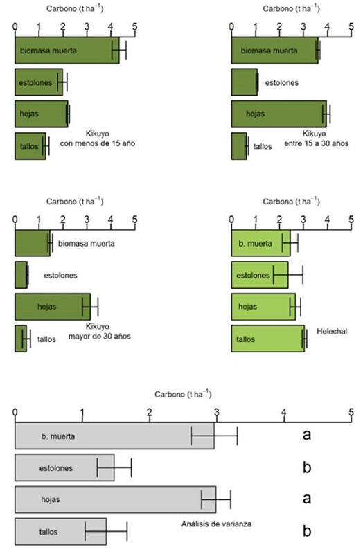 Las mayores existencias de carbono en la biomasa aérea, se encontró en los compartimentos de hojas y biomasa muerta, cuyo aporte de carbono fue mayor al de estolones y tallos (P<0.05; Figura 4).