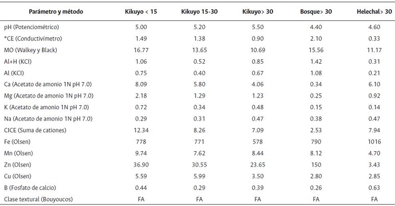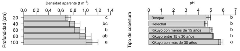 La densidad aparente del suelo tendió a incrementar con la profundidad del perfil analizado, como sucede en la mayoría de los suelos por el efecto del peso de las capas superiores (Figura 5). Hubo diferencias significativas por efecto del relieve independiente del tipo de cobertura, encontrándose valores de 0.64 t m-3 para el relieve cóncavo, mientras que los valores para los relieves convexo y plano fueron de 1.03 y 1.06 t m-3, respectivamente. El suelo con pasturas de kikuyo por más de 30 años, mostró mayor pH con respecto a las demás coberturas evaluadas (Figura 5). Igualmente, los análisis físicoquímicos de los suelos a 0-20 cm de profundidad, también indicaron tendencias a cambios por el uso de pasturas de kikuyo con mayor contenido aparente de bases intercambiables y de algunos elementos menores (Tabla 1).
