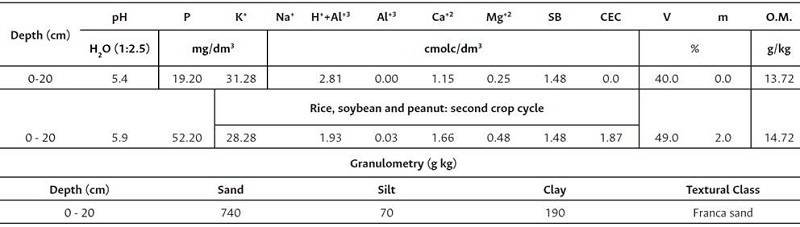 This fact is evidenced in the sequential crops of rice, soybean, and peanut, since the peanut presented preference for mineral fertilization in the first crop (Table 5), while in the second one (Table 6), some improvements on the soil solution were noticed, such as V% that was within the appropriate range (40 %) proposed by Malavolta et al. (1997), who classified the values between 40.1 and 60 % in a layer of 0.20 m as adequate (Table 1). An increase in phosphorus content in the 0.20 m soil layer was also observed in the second crop.