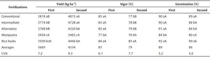 The variance analysis performed with the data revealed interaction between the factors plantings and alternative fertilization for yield and vigor. However, the variables yield, vigor and germination showed significant differences for the fertilization factor, which were detailed in Table 2.