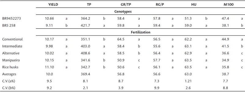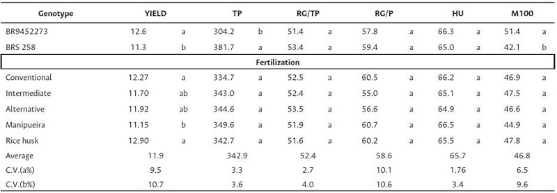 The analyses performed on the different variables evaluated in the two genotypes (BR 9452273 and BRS 258) of soybean in conventional (chemical), intermediate (half of the chemical + alternative), and altemative crops showed differences in their mean valúes (Table 3). It was verified that the variation coefficients were low (< 9.9 %), indicating accurate resúlts.