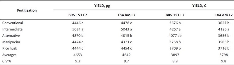 It is worth highlighting the superiority of 11.7 % in the yield of peanut grains of the BRS 151 L-7 genotype within the alternative fertilization compared to the other ones in the first crop (Table 5). Similar values were also obtained with the genotype BRS 151 L-7 for peanut grain yield between intermediate fertilization and alternative, conventional, and manipueira fertilizations.