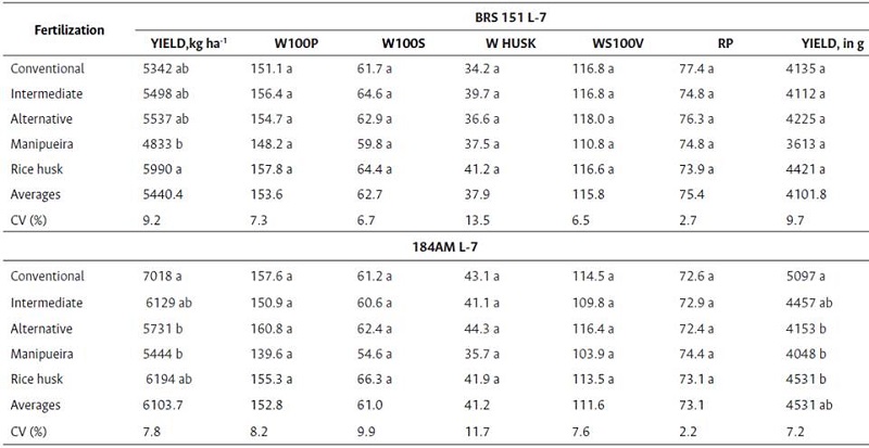 The yield of BRS 151 L-7 peanut pods in the second crop was affected by the fertilizations, showing that the use of charred rice husk fertilizers produced more than 800 kg of grains (Table 7) compared to the fertilization composed of manipueira. In addition to this, in the genotype 184AM L-7 there was also a significant difference in the yield of pods due to fertilization, especially in conventional fertilization, which presented greater results compared to the fertilization with charred rice husk or manipueira.
