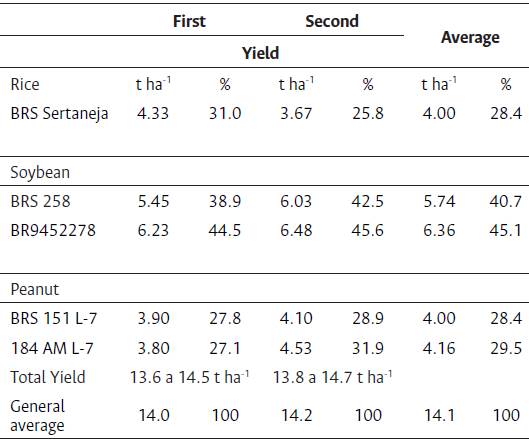 In the two crops of the three grains studied (Table 7), the yield of soybean BR9452278 showed higher values in relation to rice BRS Sertaneja and peanuts in the same year of cultivation, representing on average 31.6 % of the grains produced in the cycle. In addition, for peanuts and soybeans, there was an increase in yield from the first to the second planting, with the opposite occurring with the rice crop (Table 7). In the second planting, BRS Sertaneja showed a decrease of 16.77 % in relation to the first crop (Table 7), with average grain yield (between the two crops) of 4 t ha-1 On the other hand, the soybean yield of cv. BRS 258 in the second planting showed a gain of 8.47 % in relation to the first planting (Table 7). Sequential plantings used in two consecutive cycles resulted in approximately 14 t ha-1 of grains in the area of the Roraima Cerrado; the proportions were: rice 28.4 %, peanut 29 %, and soybean 42.6 %.
