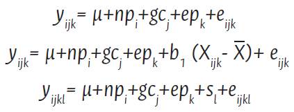 Se calculó la media, la desviación estándar y el coeficiente de variación para cada una de las características. Posteriormente, los datos fueron sometidos a un análisis de varianza para determinar la influencia de algunos efectos sobre estas características de crecimiento. Los modelos utilizados fueron los que se describen a continuación: