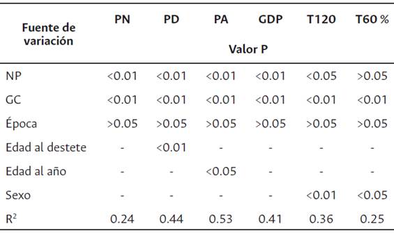 Los factores que afectaron significativamente (P<0.05) cada característica de crecimiento en el BON son presentados en la Tabla 2 y fueron el número de parto (NP) (excepto para T60 %), el grupo contemporáneo (GC - hato-año-sexo para PD, PA, PN, GDP y hato-año para T120 y T60 %), el sexo (T120 y T60 %) y la edad al pesaje (para PD y PA), mas no la época de pesaje.