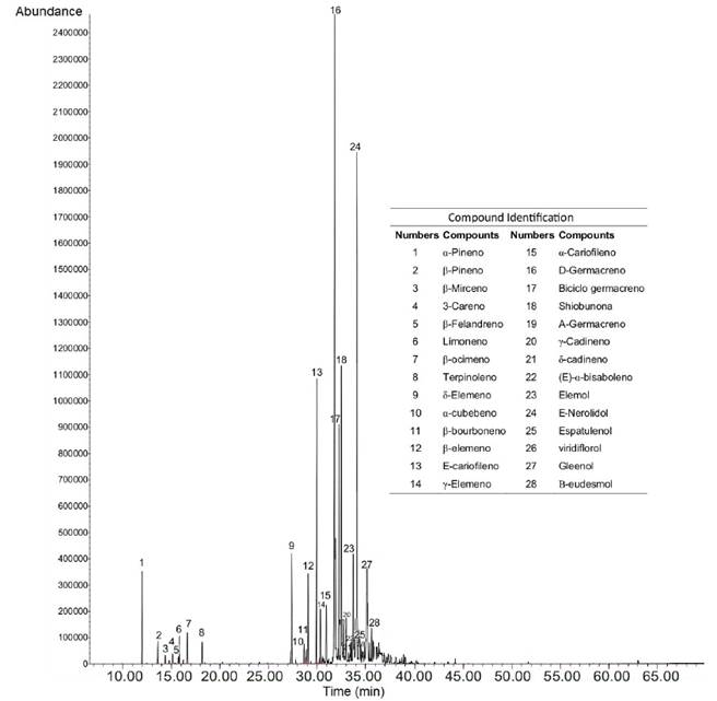 The chemical composition of S. guianensis EO was analyzed using GC-MS, obtaining the chromatogram observed in Figure 1 and the results presented in Table 1. In total, 28 compounds were detected, the predominant of which were D-germacrene (26.5 %); (E)-nerolidol (21.5 %); (β-caryophyllene (9.3 %); elemol (8.0 %); bicyclogermacrene (7.5 %); 5-elemene (3.5 %); β-elemene (3.0 %) and α-pinene (2.6 %). In general, a predominance of sesquiterpenes (94 %) and a lesser proportion of monoterpenes (6 %) were found.