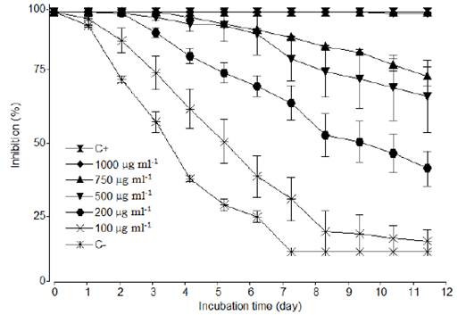 The growth of the fungus was completely inhibited during the entire incubation period at a concentration of 1000 μg ml-1 EO (p < 0.001), a similar result to that achieved with the control treatment, which in the in vitro experiment corresponded to Copper oxychloride (Figure 2, p < 0.001). However, treatments with an EO concentration of 100 to 250 μg ml-1 had no effect on the inhibition of M. roreri (p < 0.001).