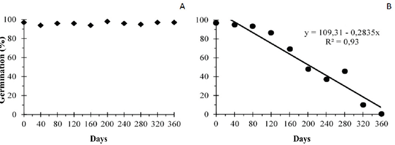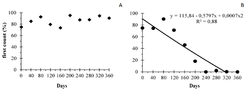 Newly harvested seeds recorded a first germination mean count of 75 %. However, the highest means recorded for seeds stored in refrigerator were above 80 % over the evaluated periods (Figure 1A), whereas means recorded for seeds stored under natural conditions significantly decreased after 120 DAE until they dropped to zero after 240 days (Figure 1B).