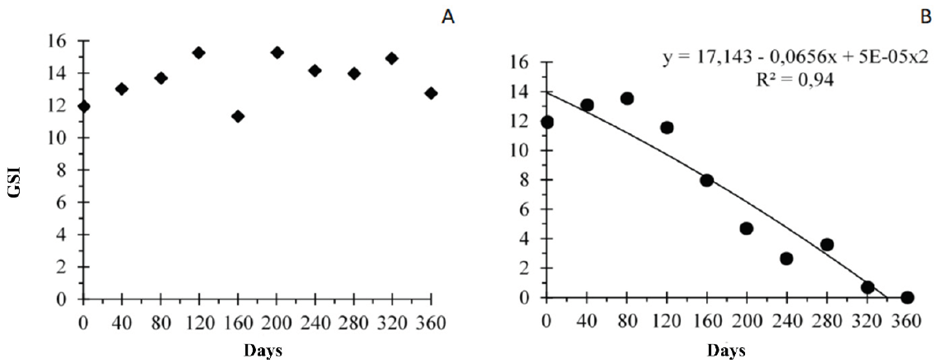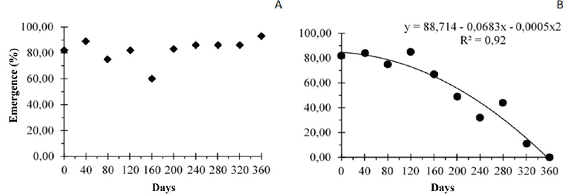 The germination of jambu seeds stored in refrigerator remained higher than 90 %, even in the last evaluated period (Figure 2A). Seeds stored under natural conditions presented adjustments to the quadratic regression model, with an increasing emergence time, while germination during storage decreased until it presented a significant reduction after 120 DAE (Figure 2B). Seeds stored in refrigerator did not show a significant correlation between storage time and germination speed index (GSI), based on the regression model (p < 0.01) (Figure 3A). On the other hand, seeds stored under natural conditions (Figure 3B) recorded significantly decreased GSI after 120 DAE until it reached zero at 360 days.