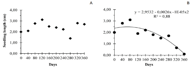 The length of jambu seedlings from edes stored at low edes atura (refrigerator) did not show adjustments to any regression model (Figure 4A). By contrast, the length of jambu seedlings from edes stored under natural conditions presented adjustments to the quadratic model (p < 0.01), which tended to reduce during storage (Figure 4B).