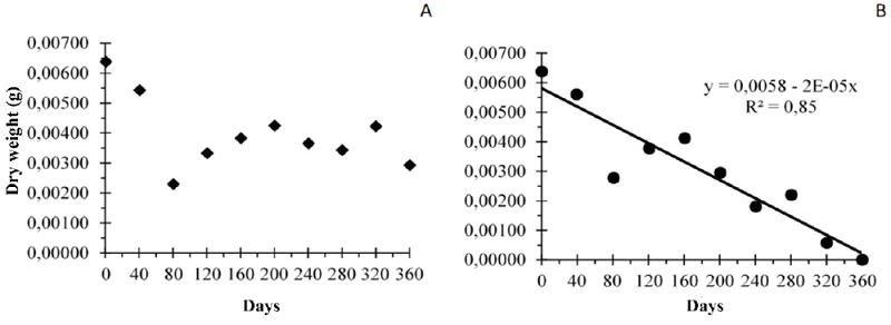 Based on the evaluation of dry mass accumulation, it was observed that the quality of seeds stored in refrigerator remained unchanged and did not require adjustments to any quadratic model (p < 0.01) (Figure 5A). On the other hand, seeds stored under natural conditions presented adjustments to the quadratic model (Figure 5B), which assured dry mass accumulation between 120 and 160 DAE; dry mass accumulation values decreased until the end of the storage period.