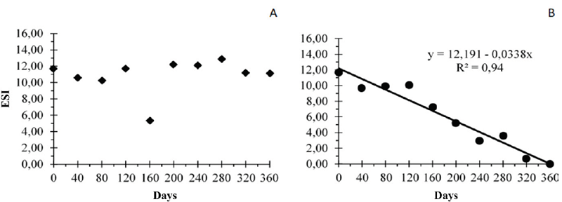 The emergence rate of jambu seedlings stored in refrigerator remained higher than 80 % in most of the evaluated periods until the end of the tests (Figure 6A). This outcome indicates the conservation of the physiological potential of these seeds since the pre-storage rate was 82 %. The emergence of jambu seedlings stored under natural conditions was significantly affected by storage time and conditions (Figure 6B), since only 50 % of the seedlings had emerged at 200 storage days. Seeds stored in refrigerator (Figure 7A) did not show significant correlations between the emergence speed index (ESI) and storage time, since there was no significant increase or decrease in ESI - the pre-storage index was 11.68 and the post-storage index was 11.12. However, seedlings stored under natural conditions presented significantly decreased ESI over storage time until it reached zero at 360 days (Figure 7B).