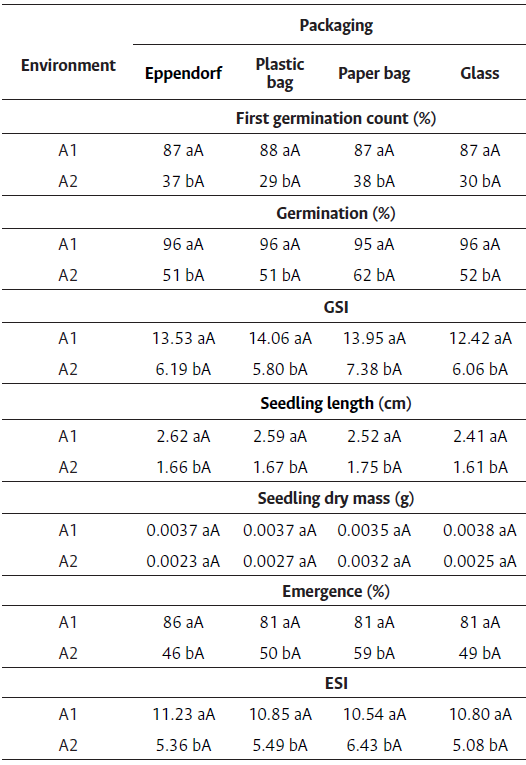 The experiment followed a completely randomized design, with four repetitions containing 50 seeds; the treatments were analyzed based on two factorial arrangements: 2 x 4 (environment x packaging) and 2 x 9 (environment x storage period). Data were subjected to analysis of variance; means were compared through Tukey’s test (p < 0.05). The quantitative data were subjected to polynomial regression analysis at R2 ≥ 60 %. The variables analyzed were germination, first germination count, germination speed index, seedling length, seedling dry mass, emergence, and emergence speed index.
