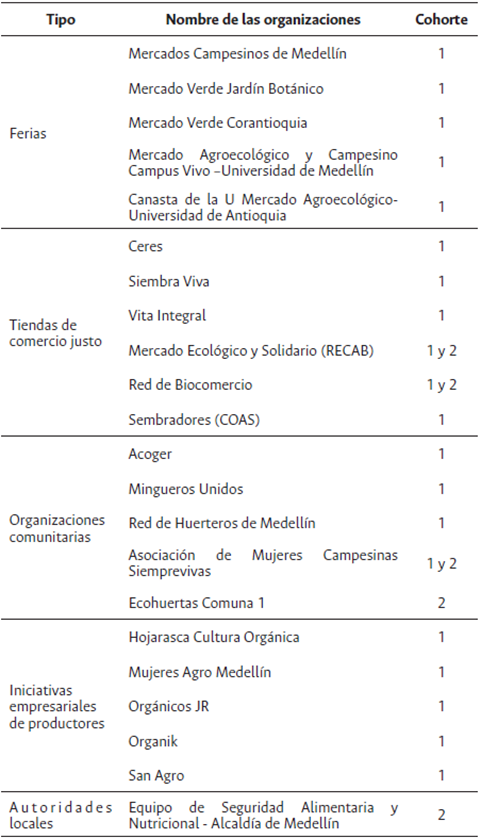 Se realizó un estudio cualitativo, tipo casos colectivos, derivado de proyectos de investigación que han caracterizado las RAA en el departamento de Antioquia, Colombia. De estas redes se clasificó información específica sobre calidad e inocuidad de alimentos. En el primer proyecto se entrevistaron 20 líderes y lideresas (Tabla 1) de ferias (mercados campesinos, agroecológicos o verdes), tiendas especializadas en comercio justo e iniciativas empresariales de productores de alimentos frescos (verduras, frutas, granos, tubérculos, plátanos, cereales, huevos, leches y productos lácteos), quienes refirieron a once (11) agricultores y agricultoras y cinco (5) consumidores institucionales tipo restaurante. Se realizó observación participante en espacios de comercialización de alimentos y no participante en lugares de producción.
