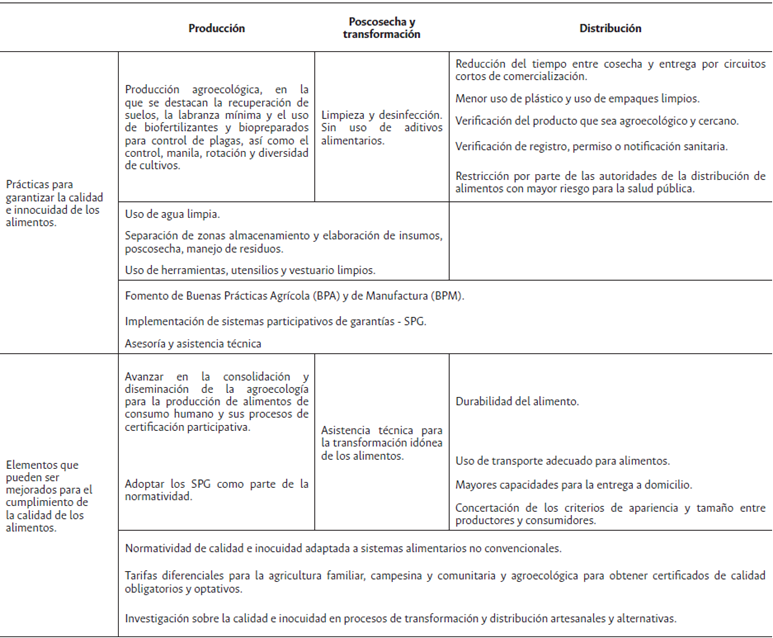 En las RAA estudiadas se trata de garantizar al máximo la calidad e inocuidad de los alimentos. En la producción se pone gran atención al agua usada y a evitar al máximo el uso de agroquímicos para cuidar la inocuidad química de los alimentos, también se realizan algunos cuidados poscosecha, como la selección de los alimentos y el lavado con agua limpia. Se cuidan las condiciones higiénico sanitarias en todos los eslabones de la cadena para garantizar la calidad microbiológica, además de pensar en la salud del consumidor y del agricultor, garantizando inocuidad química. Se identifica también que al estar ausentes los agroquímicos y aditivos, son los circuitos cortos de comercialización los que pueden favorecer la preservación de los alimentos. No obstante, se identifican algunos retos en el cumplimiento de la normatividad, por ejemplo, la obtención de registros sanitarios cuando estos son requeridos; si bien se evidencia alguna flexibilización en la adquisición de este tipo de certificados, todavía el proceso es costoso en función de las economías campesinas; por lo anterior, se requiere apoyo estatal. También se deberá invertir en la asesoría y asistencia técnica que fomente la transición a la agroecología entre agricultores familiares y campesinos, en el equipamiento requerido para realizar mejores procesos de poscosecha, transformación y transporte de los alimentos, así como fomentar la investigación para preservar la calidad e inocuidad de los alimentos en los procesos de producción, procesamiento y distribución alternativos.
