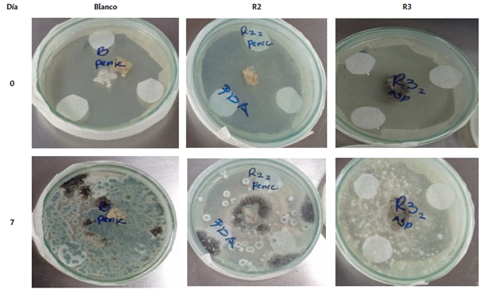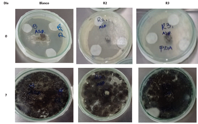 En cuanto a la evaluación antifúngica de los recubrimientos evaluados, las Figuras 10 y 11 muestran los resultados obtenidos, tanto para Aspergillus como para Penicillum. Las pruebas antimicrobianas se hicieron con las formulaciones R2 y R3 ya que presentaron mejor característica en la formación de recubrimiento. Cabe aclarar que todas las formulaciones contenían la misma concentración de extracto de tomillo (0.05% v/v). Las figuras presentan los cultivos y el blanco a día cero, y luego de 7 días de cultivo.