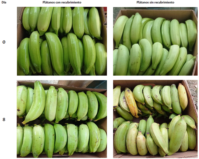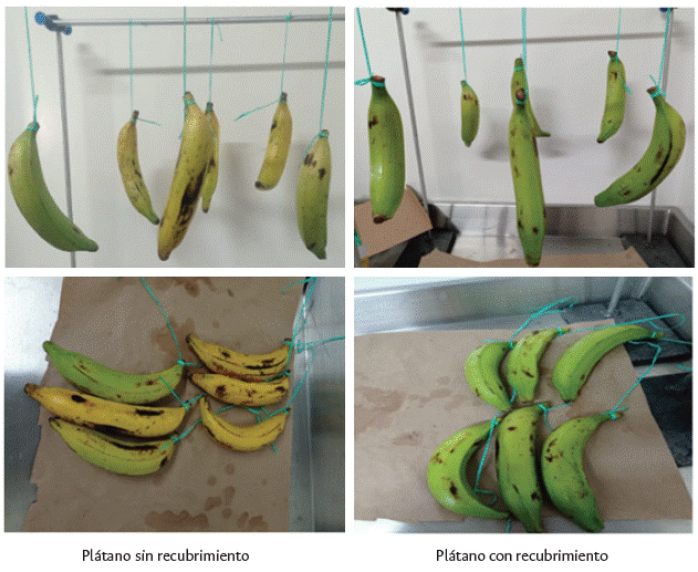Finalmente, los frutos fueron recubiertos por inmersión de manera individual (cada plátano por separado) en 300 mL de la solución formadora del recubrimiento durante 1 min, se colgaron del pedicelo para evaluar la maduración en el tiempo y se compararon los frutos que tenían recubrimiento y con el no recubierto, que fue usado como patrón.