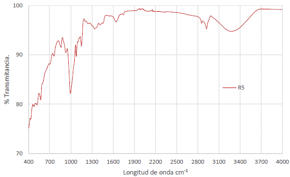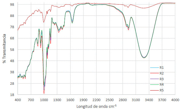 Una vez obtenido el almidón fue caracterizado con espectroscopía de infrarrojo por transformadas de Furrier (FTIR), para lo cual se empleó un equipo PerkinElmer Spectrum IR, modelo Spectrum Two, serie 112801, en un rango de barrido entre 4000 y 450 cm-1, en el cual se hicieron medidas de porcentaje de transmitancia.