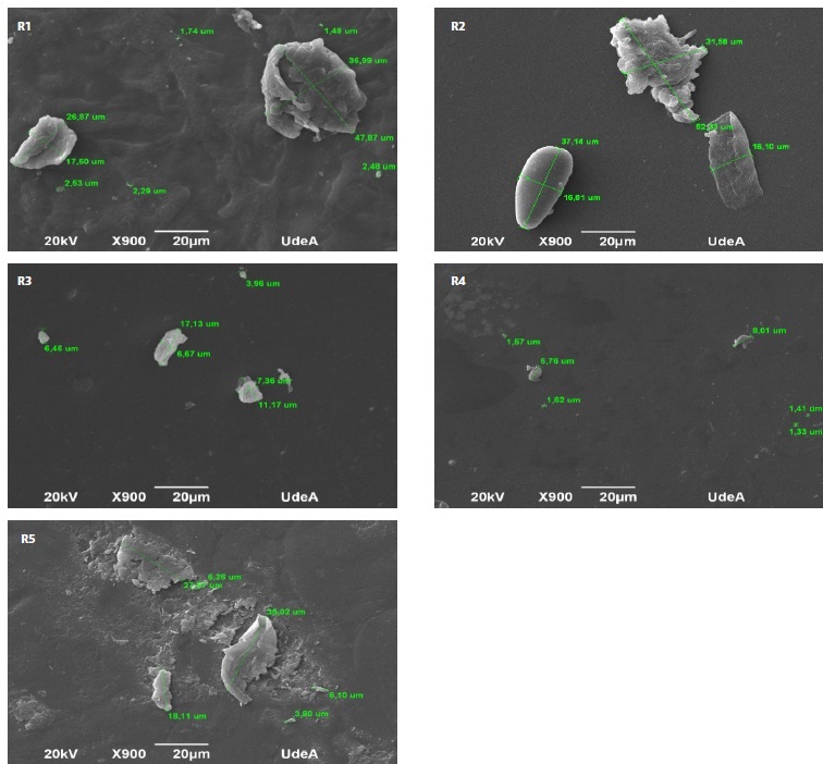 La mayor cantidad de estructuras amorfas se presentó en los recubrimientos con mayor concentración de almidón (R1 y R2), lo que también puede sugerir parte no disueltas de este. Por su parte, el recubrimiento R5, que no contenía glicerol, mostró gran cantidad de partículas, las cuales corresponden a fragmentos no solubilizados de almidón, lo que origina el rompimiento de la película a la hora de su manipulación. En el recubrimiento R3 se observan partículas de 8.79 µm de diámetro aproximadamente, además, presentó una textura más homogénea, lisa y con pocas rugosidades, lo que indica una mejor interacción entre los componentes.